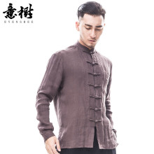 意树复古中国风衬衫男青年长袖纯色亚麻衬衫原创民族风修身衬衣