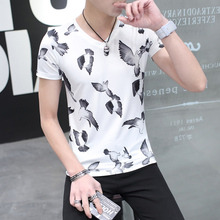 夏装韩版男士短袖T恤V领半袖印花体恤修身潮流青少年学生简约百搭