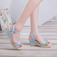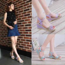 2017夏季新款清新牛仔布甜美蝴蝶结麻底草编坡跟凉拖鞋高跟厚底鞋