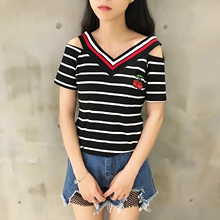 2017春夏新款条纹短袖t恤女学院风拼接V领露肩修身韩版上衣打底衫