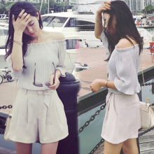 2017夏季韩版女装新款学生小清新连衣裤雪纺短袖一字领连体短裤潮