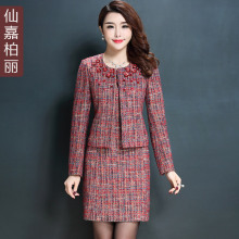 毛呢连衣裙2017春秋冬新款妈妈装修身婚礼两件套加厚包臀套装裙