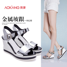 奥康女鞋 夏季新款时尚金属皮休闲坡跟一字带金属扣女凉鞋