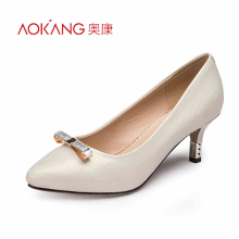 奥康女鞋新品珠光水钻蝴蝶结单鞋通勤尖头猫跟鞋女