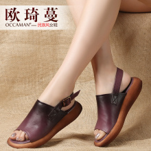 欧琦蔓2017夏新款羊皮厚底凉鞋女松糕底镂空复古坡跟休闲女鞋6811