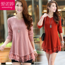 爱诺婷2017春装新款韩版蕾丝拼接显瘦中长款针织打底衫毛衣外套女