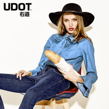 右道立领蝴蝶结系带喇叭袖宽松优雅牛仔衬衫女春款欧美衬衣UC5204