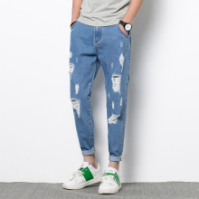 胡小五牛仔裤男士春季哈伦裤破洞九分裤日系小脚裤修身9分裤潮