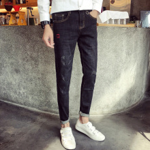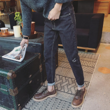 港仔春季新款弹力牛仔裤男士刺绣韩版修身型青少年小脚牛仔裤子潮