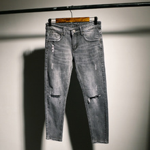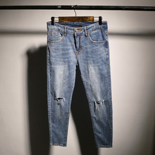 夏季膝盖破洞九分牛仔裤男士鸟店东大门韩版修身做旧潮流小脚裤男