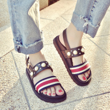 2017韩版厚底缝制女鞋平底露趾松紧带女学生凉鞋夏季百搭防滑鞋子