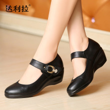 品牌女鞋中老年坡跟妈妈鞋真皮鞋扣带单鞋圆头方口鞋秋40 50 60岁