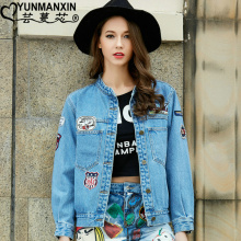春天圆领丹宁牛仔衣短外套棒球服 宽松徽章贴布立领牛仔外套女