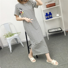 春夏季韩版睡衣简约条纹短袖女士睡裙纯棉卡通米奇家居服显瘦长裙