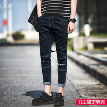 TCC秋冬新款男士薄款拼接破洞牛仔九分裤时尚潮韩版休闲9分牛仔裤