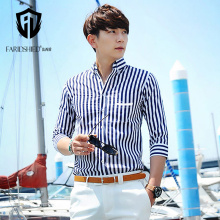夏季男士竖条纹七分袖衬衫韩版修身商务休闲衬衫免烫衬衣纯棉寸衫