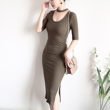 2017夏装新款性感气质修身显瘦墨绿choker中袖侧边开叉裙连衣裙女