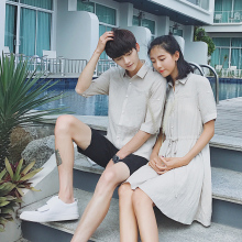 海边沙滩情侣装夏装连衣裙2017新款韩版棉麻情侣短袖衬衫班服学生