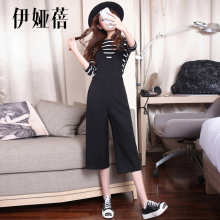 伊娅蓓2017春夏连体七分阔腿裤女高腰黑色背带裤时尚休闲宽松裤潮