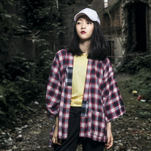 国潮BF风街头个性情侣衬衫宽松复古贴布七分袖做烂做旧女格子道袍