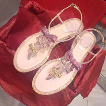 欧美2017夏季新款夹脚凉鞋蝴蝶结水钻平底性感晏会一字带女鞋