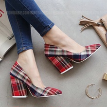 韩国代购女鞋欧美时尚格子布高跟鞋 粗跟单鞋 英伦格纹mono