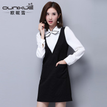 欧昵雪2017秋装新款黑色假两件雪纺衬衫连衣裙春装长袖A字短裙女