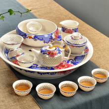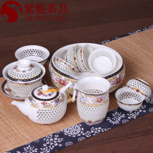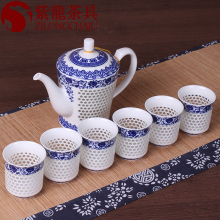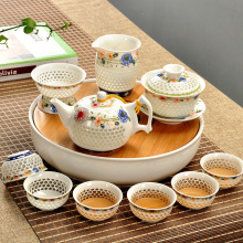 青花瓷蜂窝玲珑茶具 套装镂空茶杯整套陶瓷功夫茶具实木茶盘配件