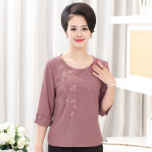 中老年女装棉麻T恤夏季新款绣花小衫中年40-50妈妈装圆领中袖上衣