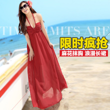 新款吊带连衣裙夏波西米亚长裙海边度假红色沙滩裙海滩高腰大码女