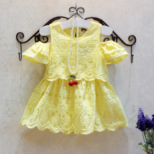 夏季新款韩版儿童装女童黄色镂空背心裙宝宝露肩蕾丝连衣裙子