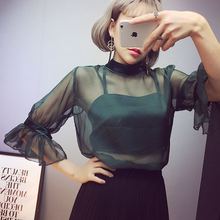 2017新款夏韩版镂空喇叭袖蕾丝衫女两件套修显瘦打底吊带衬衣套装