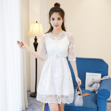 2017春季新款韩版女装中裙露背通勤绣花五分袖V领A字裙蕾丝连衣裙