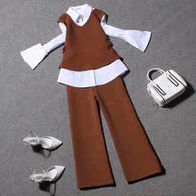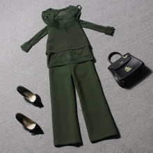 欧洲站2017新款春秋欧货时尚气质潮春季蕾丝衫毛呢阔腿裤套装女装