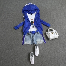 欧洲站春装新款时尚三件套连帽防晒外套T恤短裤休闲套装女G1Q1J1