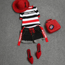 欧洲站春装新款欧货字母条纹短袖针织衫牛仔裤修身休闲套装女R1J1