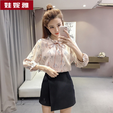 碎花雪纺衫女2017夏季新款超仙荷叶边中袖雪纺衬衫短款半截袖上衣