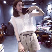 2017新款前短后长白色V领后背扣子衬衫女短袖袖韩范宽松显瘦衬衣