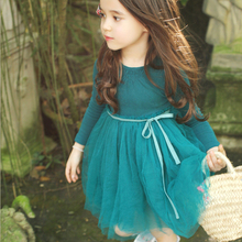 女童连衣裙秋装长袖纯色韩国童装女宝宝网纱裙子拼接款儿童公主裙