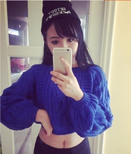 2017韩版春秋新款圆领套头针织衫女性感露脐灯笼袖毛衣短款上衣