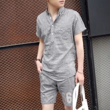 夏季韩版休闲时尚潮人宽松棉麻套头衬衫青少年潮流短裤套装上衣男