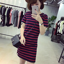 夏季连衣裙女2017新款时尚女装韩版学生宽松显瘦条纹长款T恤裙子