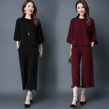 阔脚裤套装女春装时尚潮中袖纯色针织衫上衣百搭韩版流苏女九分裤