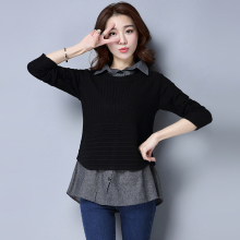 衬衫领假两件针织衫女短款春秋韩版百搭套头毛衣气质拼接打底衫潮