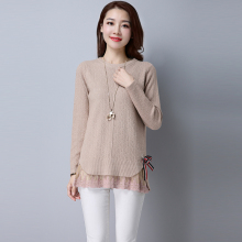 蕾丝拼接针织衫女套头短款长袖宽松百搭上衣薄春秋淑女打底毛衣潮