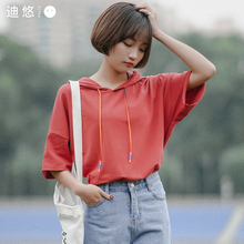 迪悠2017连帽卫衣女短袖韩版学生bf宽松套头潮新款百搭纯色闺蜜装