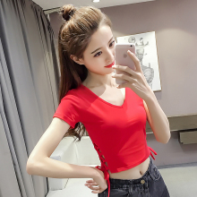 2017夏装韩版V领打底衫修身显瘦短袖T恤交叉绑带露肚脐短上衣女