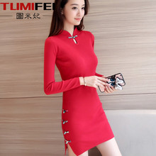 图米妃秋冬开叉打底衫女毛衣裙针织连衣裙中长款复古中国风旗袍裙