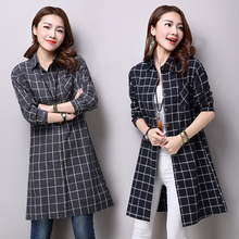 2016春秋新款大码女装文艺格子棉麻长袖修身显瘦中长款亚麻衬衫女
