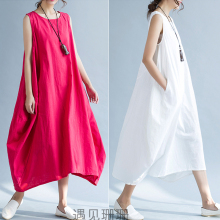 2017夏季文艺亚麻背心长裙大码口袋休闲复古棉麻无袖连衣裙女宽松